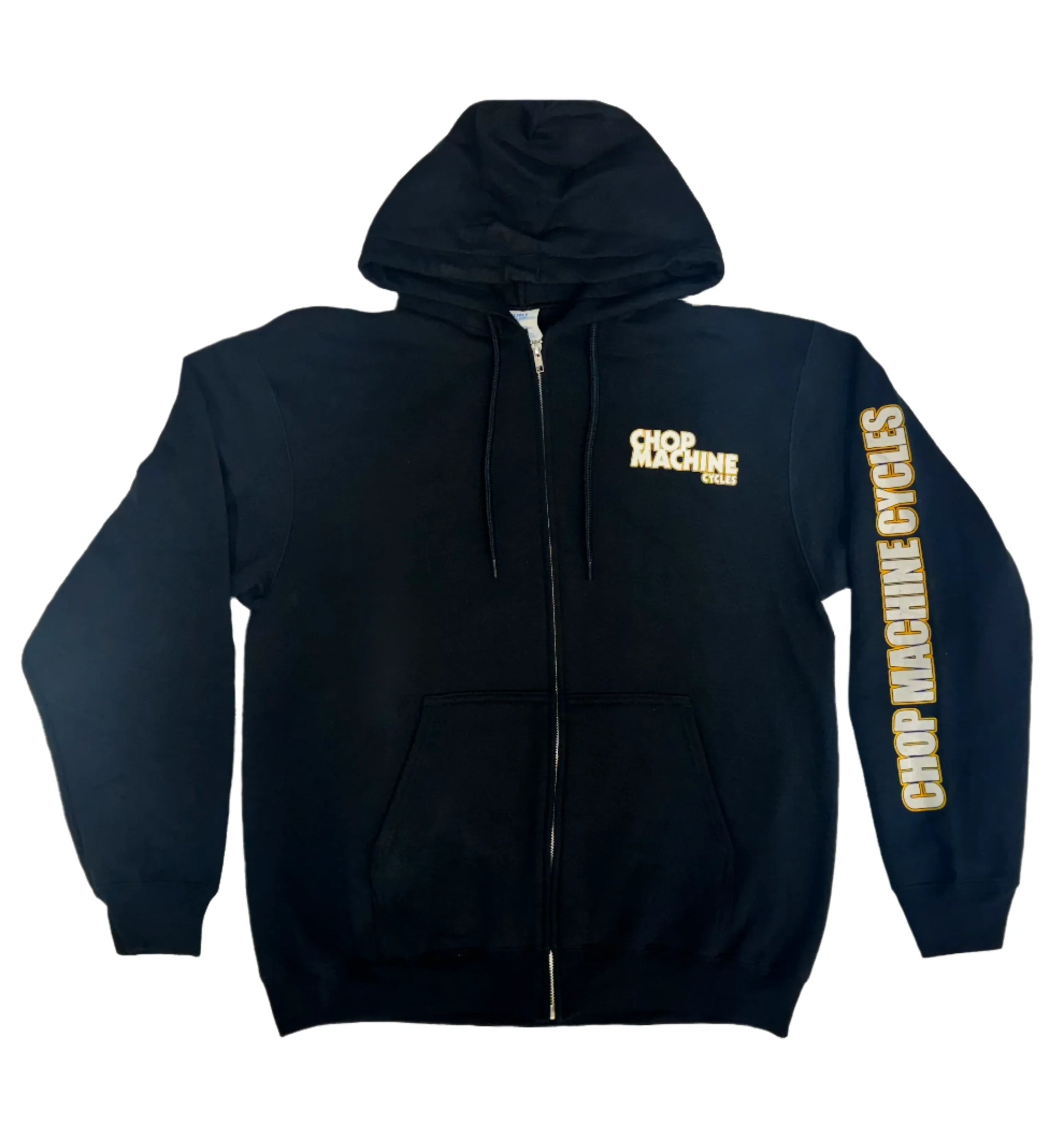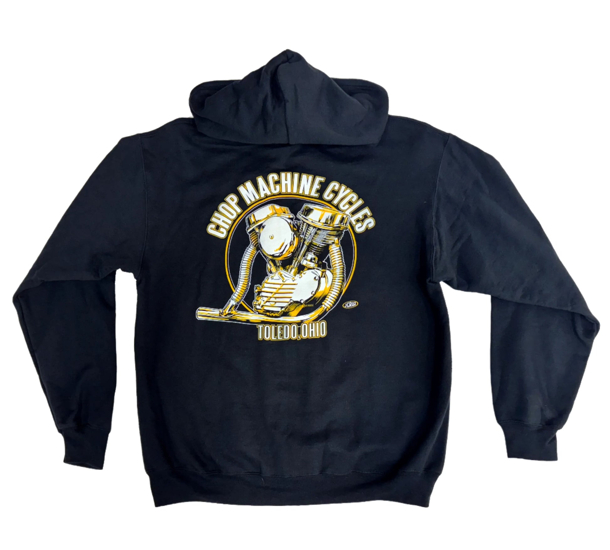 “Gold and White CMC Panhead Engine Artwork printed on Black Port & Company Zippered Hoodies.”